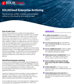 SOLIXCloud Enterprise Archiving provides a unified, scalable, and compliant cloud archive as-a-service with application-aware ingestion, custom retention policies, e-discovery, legal hold, and data access across structured and unstructured data.